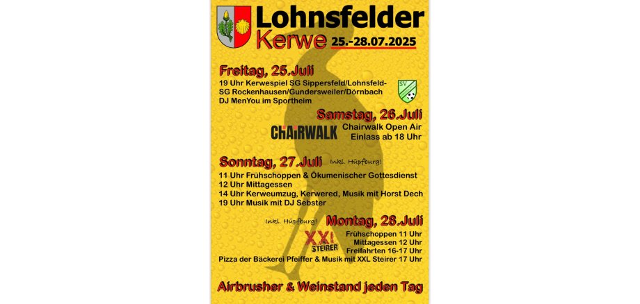 Je suis très heureux de vous souhaiter la bienvenue à notre LohnsfelderKerwe de cette année, qui aura lieu du 25 au 28 juillet 2025 sur le terrain de fête derrière la maison des sports !